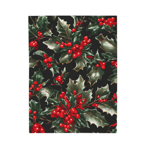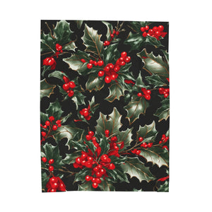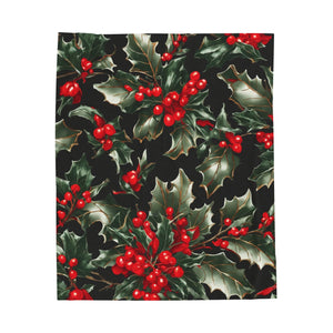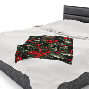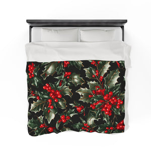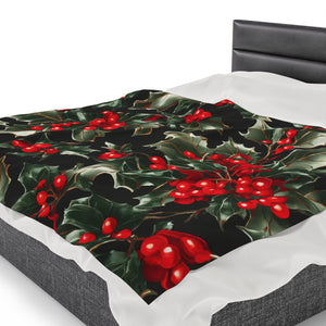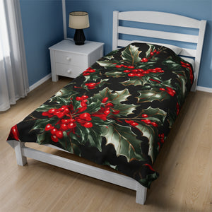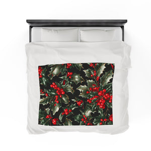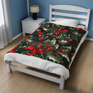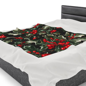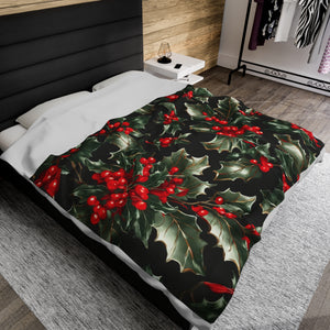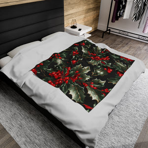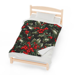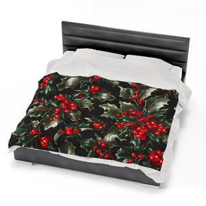 Elegant Holly of Christmas Designed Velveteen Plush Blanket Available in 3 Sizes
