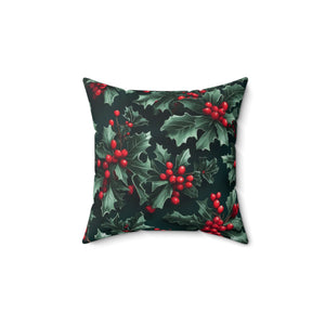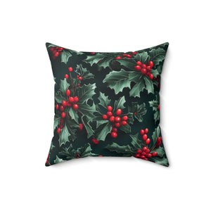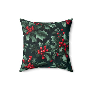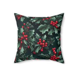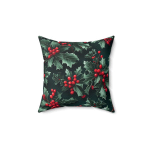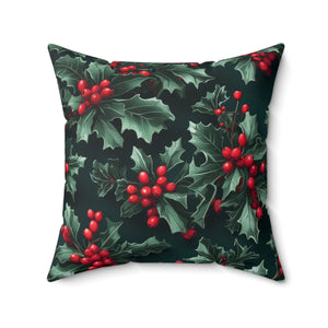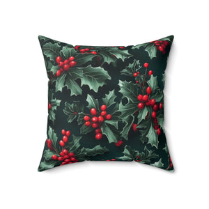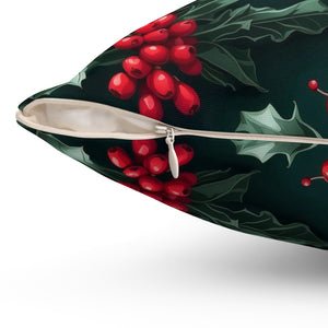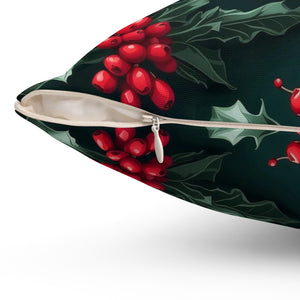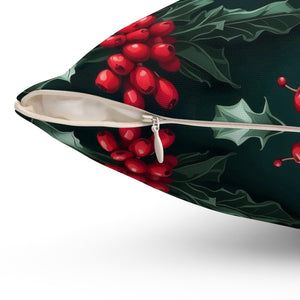 Fresh Holly and Berries Christmas Holiday Design Square Pillow - Festive 100% Polyester Décor Piece with Insert